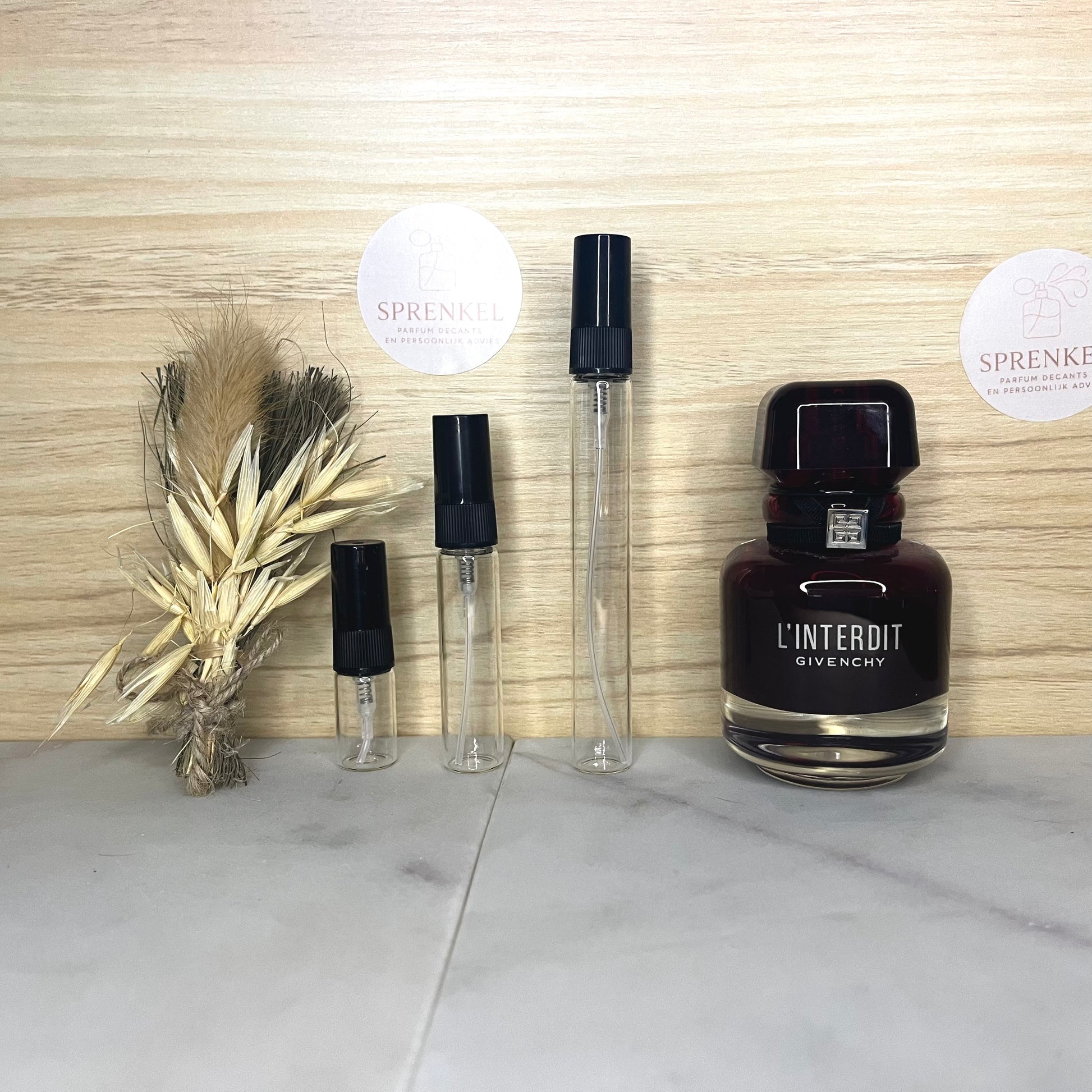 Wij bieden onze parfums uitsluitend aan in flesjes van 2 ml, 5 ml en 10 ml, allemaal voorzien van een handige verstuiver